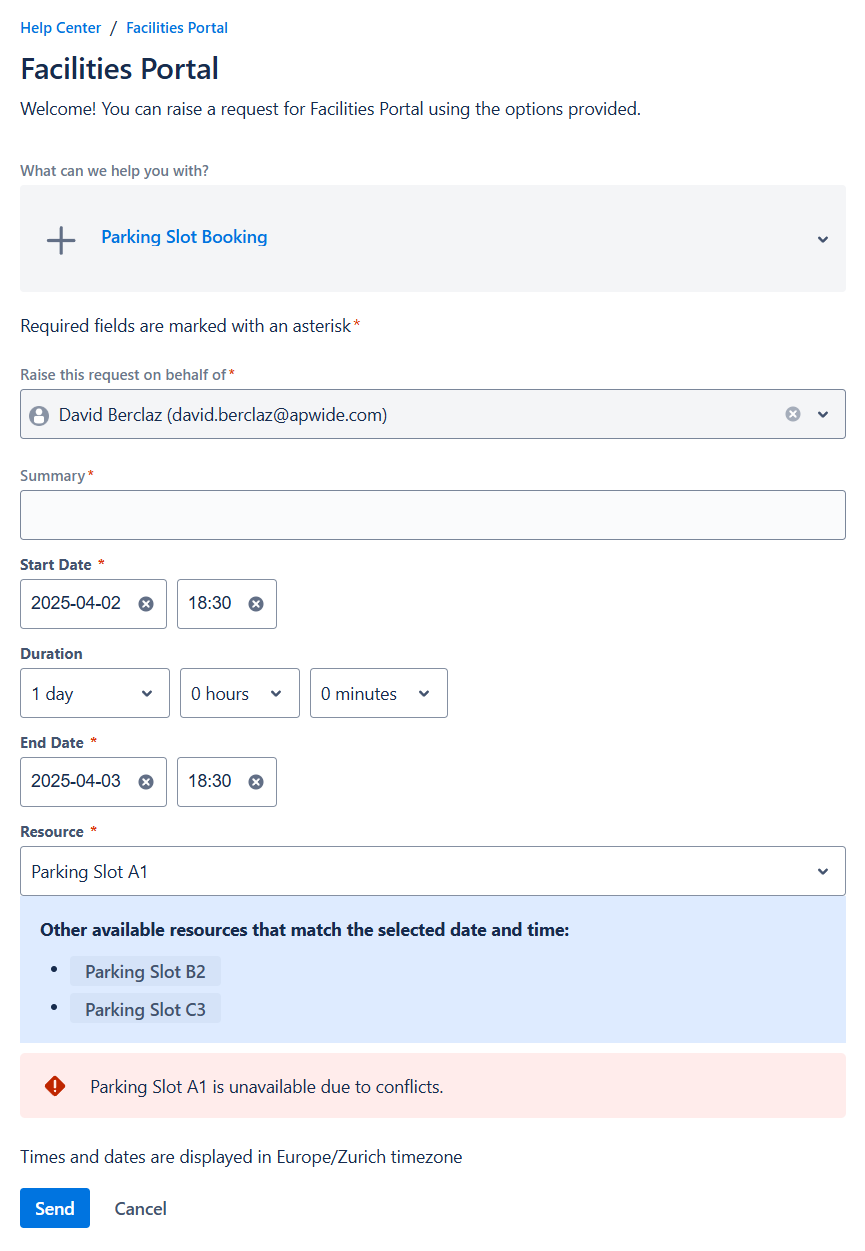 IMPROVEMENT Resource suggestions and conflict detection are now available on the Jira Service Management Portal. For detailed instructions, refer to the Creating a JSM Request documentation.